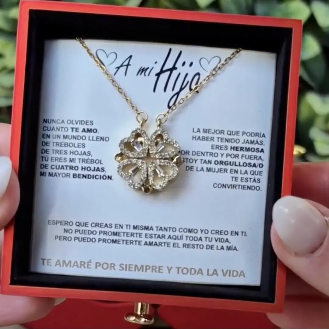Permite que tu hija lleve consigo un pedacito de tu corazón allá donde vaya. Este set de regalo, que incluye un collar con charm de trébol de 4 hojas, una Rosa Eterna y una tarjeta con un mensaje significativo, es un recordatorio atemporal de tu amor, tu apoyo y tus bendiciones.